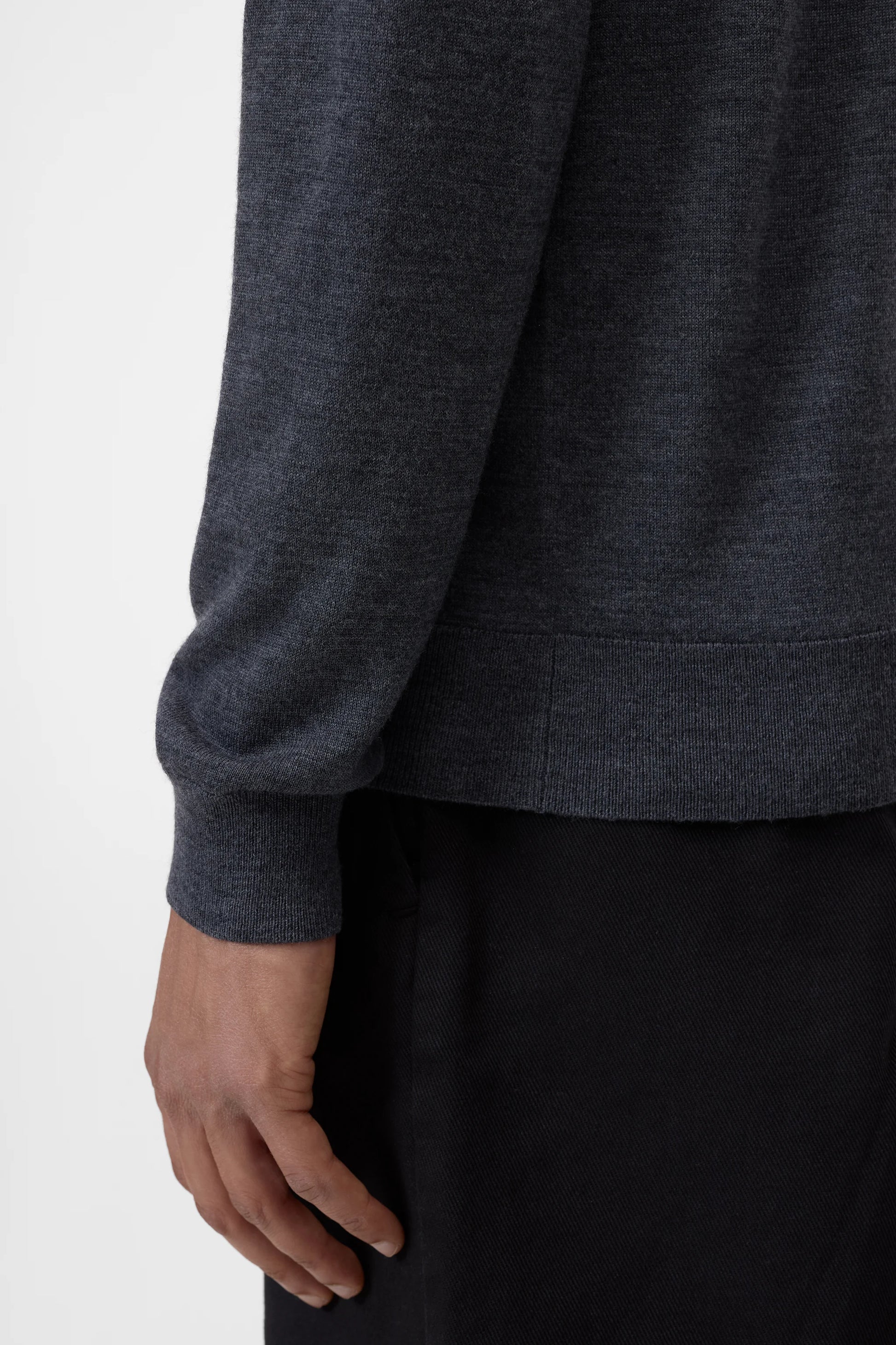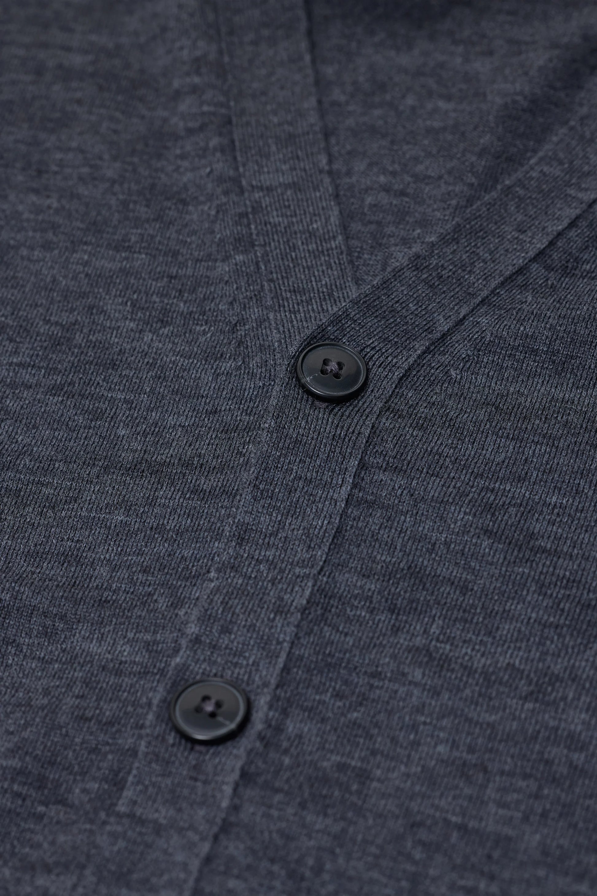 Cardigan coupe régulière en mérinos extra-fin biologique (maille fine 16g). Col en V, patte de boutonnage complète, col, poignets et bas côtelés. Certifié GOTS avec monogramme Closed discret au dos.