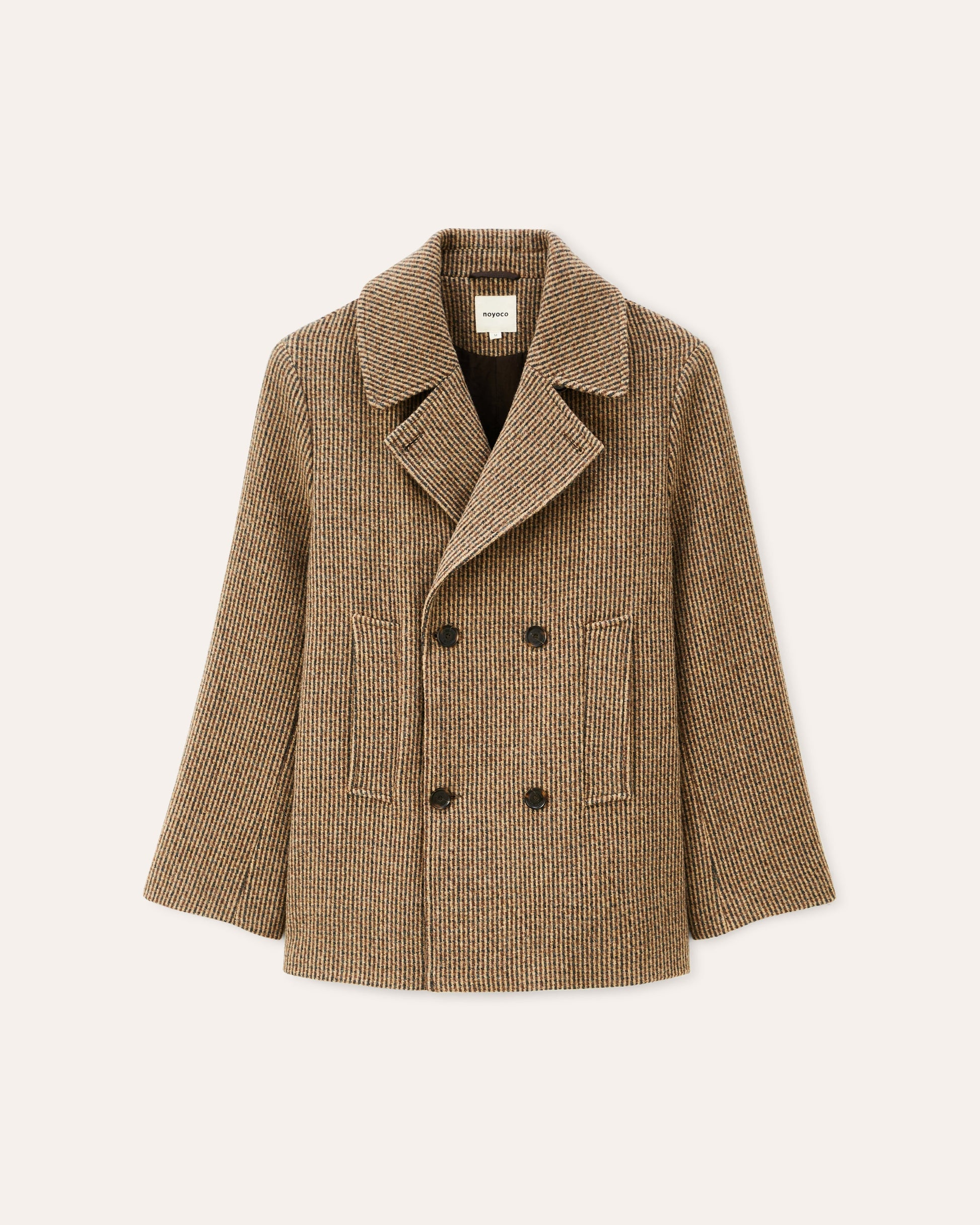 Le modèle Dundee est un caban oversize inspiré du vestiaire utilitaire des marins. Il est confectionné dans un tissu tricolore en laine recyclée, tissé en Italie. Cette veste au grand col a un double boutonnage, ce système permet de fermer le manteau dans les deux sens.