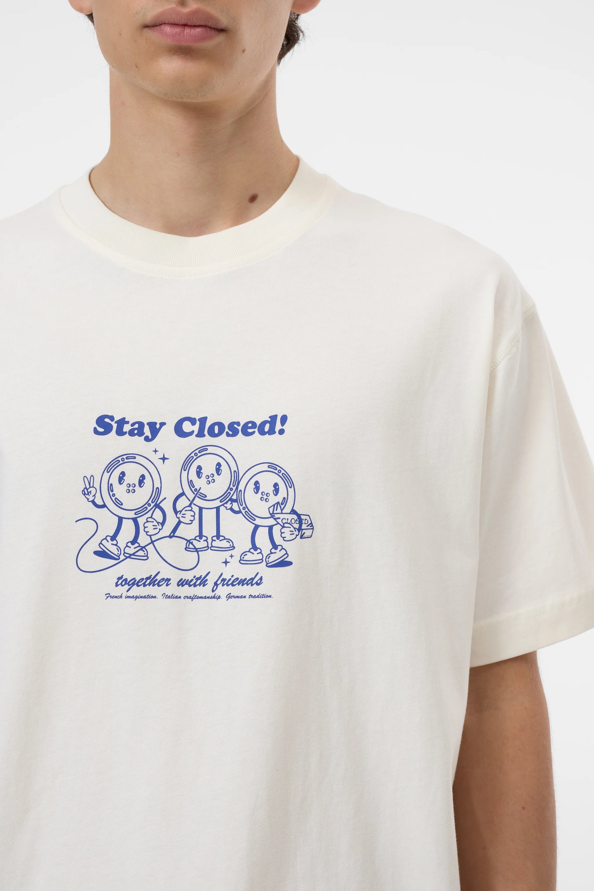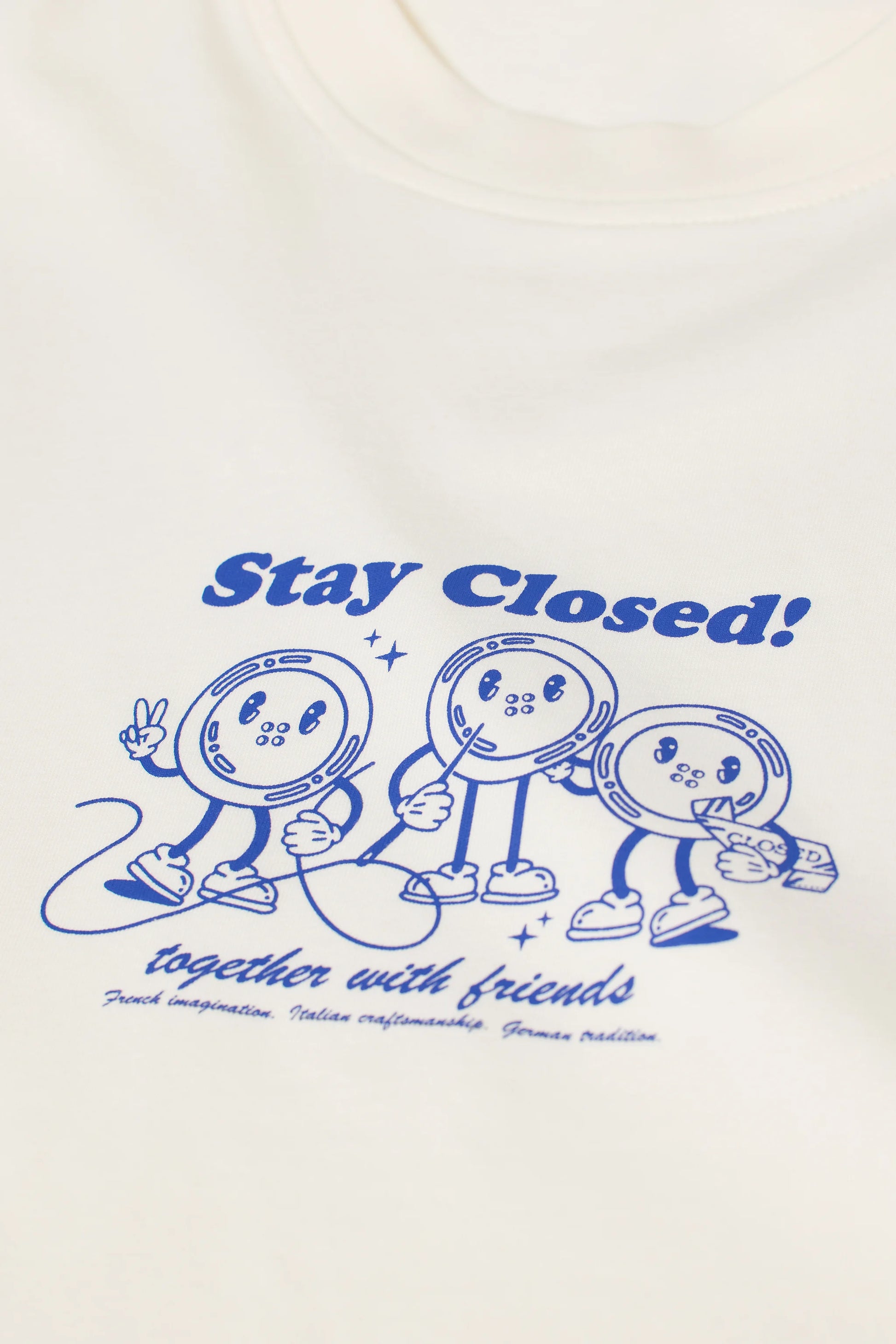 Ce t-shirt à la coupe régulière est réalisé en jersey simple compact en pur coton biologique. Il est imprimé de notre illustration saisonnière de boutons « Stay Closed ».