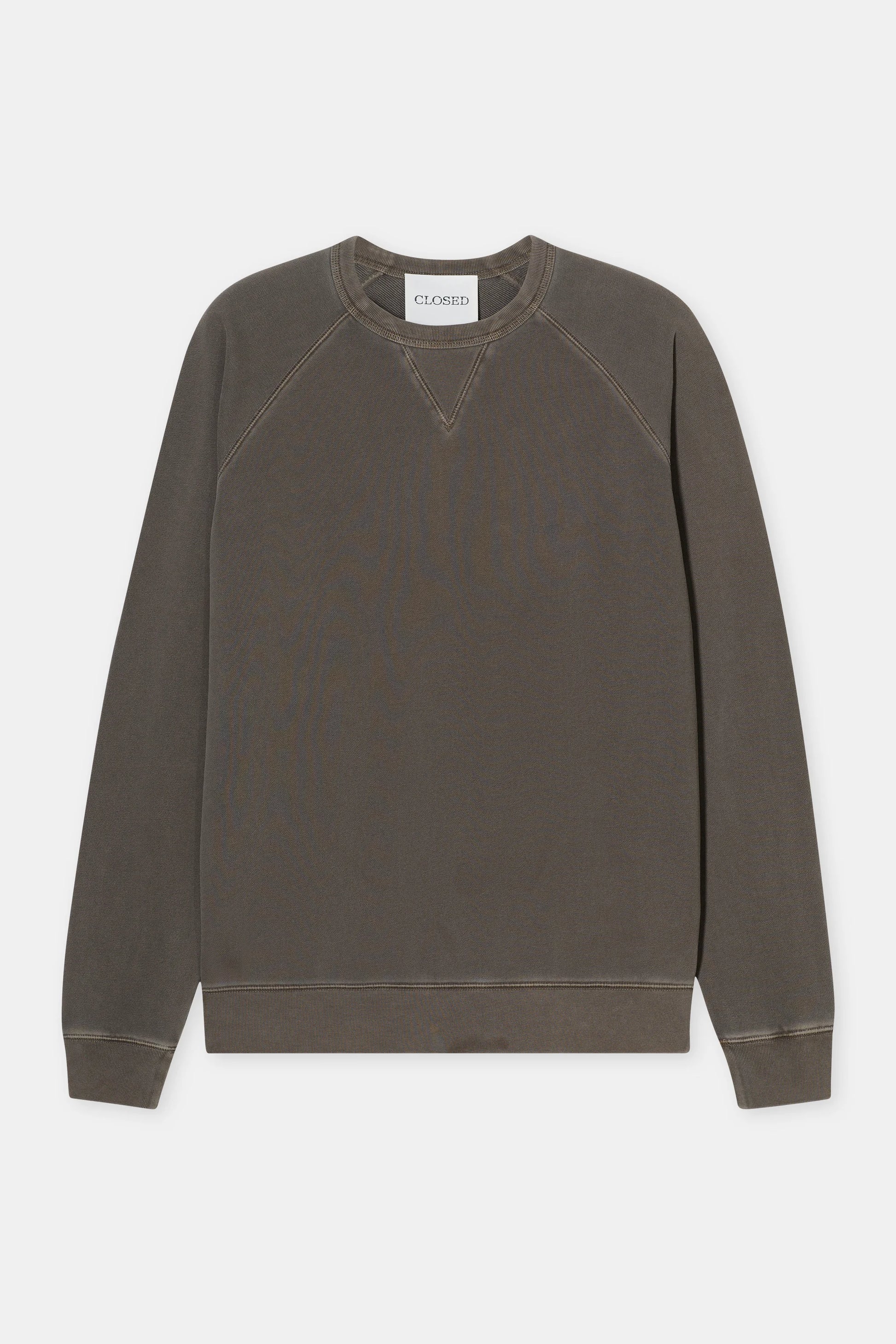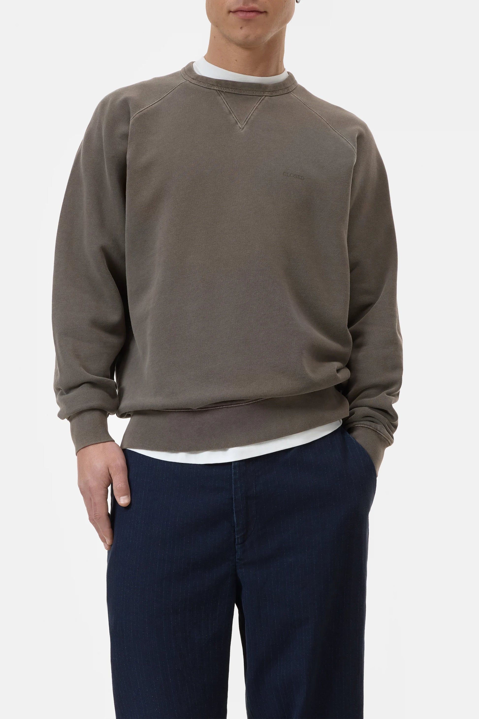 Le sweatshirt raglan est confectionné en molleton 100% coton biologique avec un procédé de teinture pigmentaire qui donne un effet délavé caractéristique. Les détails techniques comprennent un col rond avec coutures overlock, des finitions côtelées aux poignets, à l'ourlet et à l'encolure et un triangle inséré sur le devant.