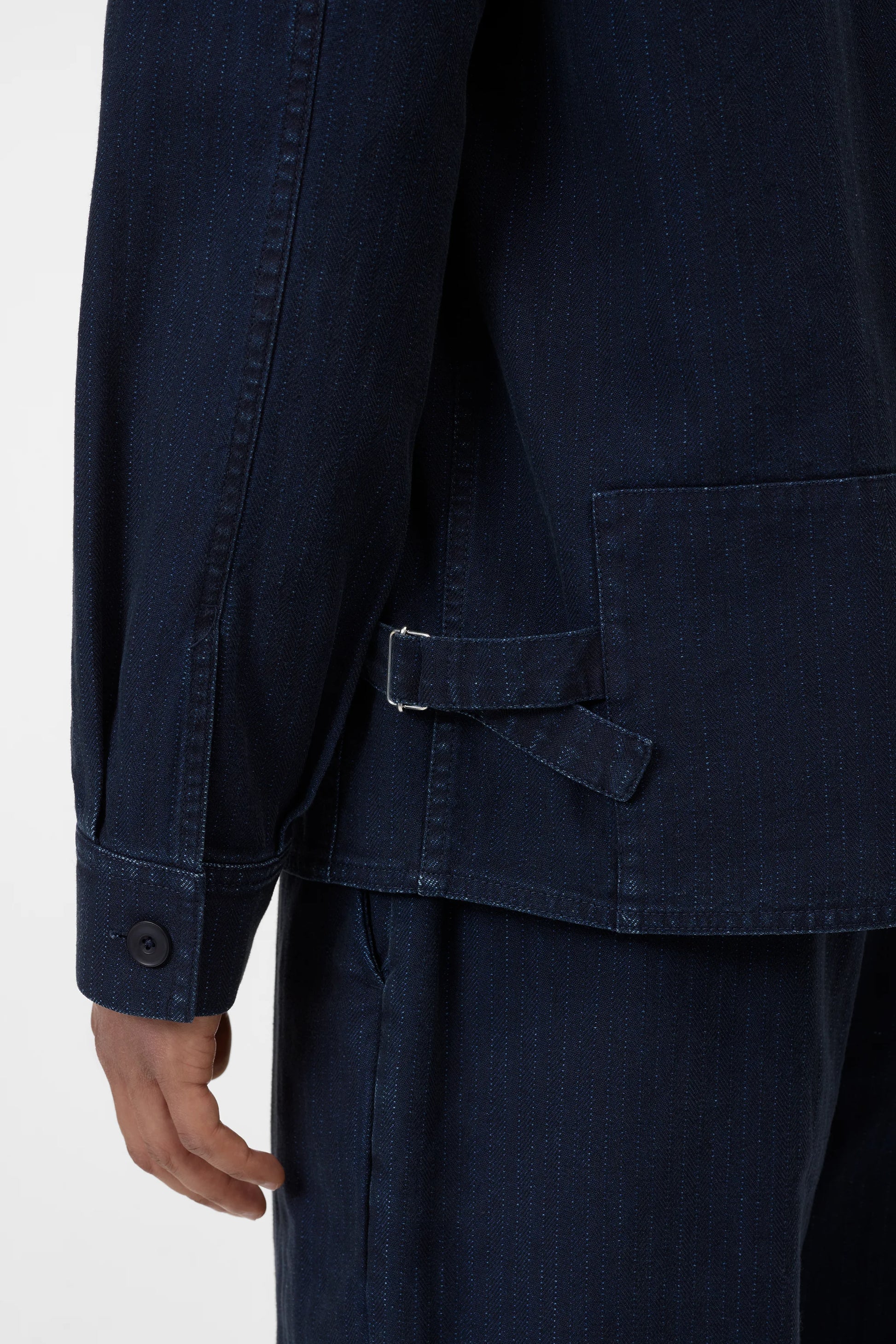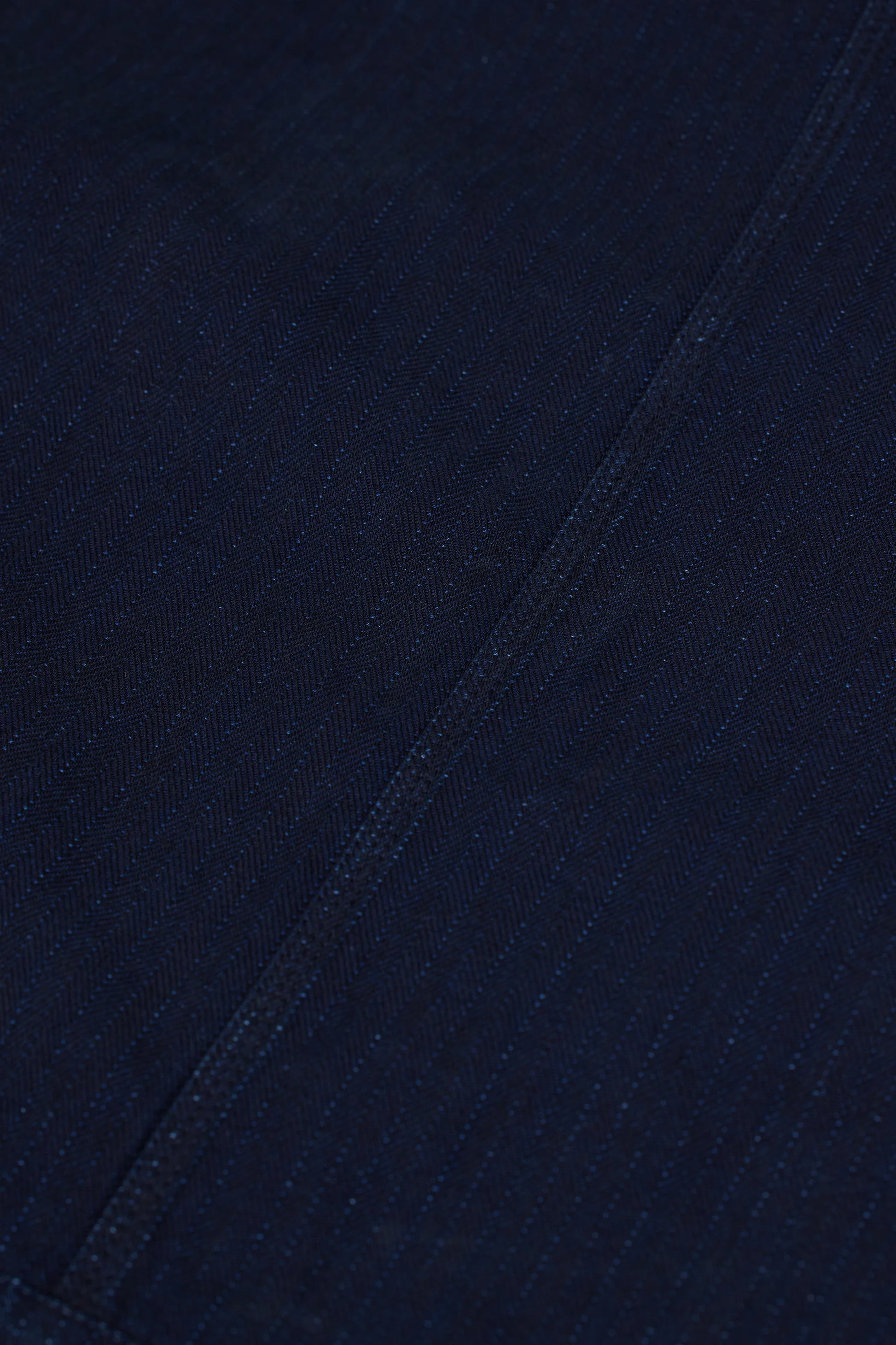 Tissu italien en twill de laine douce avec rayure craie subtile, finition brossée et aspect non lavé, doublé de pur coton. Veste Atelier à coupe régulière pour un style masculin raffiné. Se distingue par ses grandes poches, boutons aspect corne, surpiqûres décoratives inspirées des archives et empiècement signature au dos.